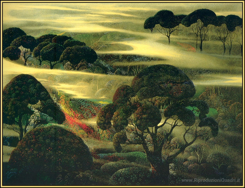 Ti offriamo una riproduzione artigianale su tela dell'opera famosa 'Foresta in nebbia' di Eyvind Earle, dal Museo delle Riproduzioni.