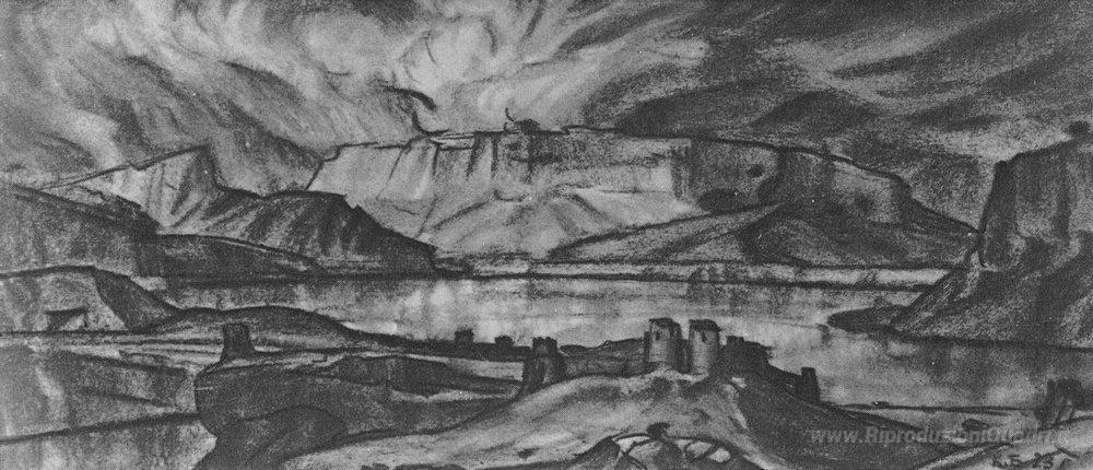 Ti offriamo una riproduzione artigianale su tela dell'opera famosa 'Fortezza in riva al mare' di Konstantin Bogaevsky, dal Museo delle Riproduzioni.