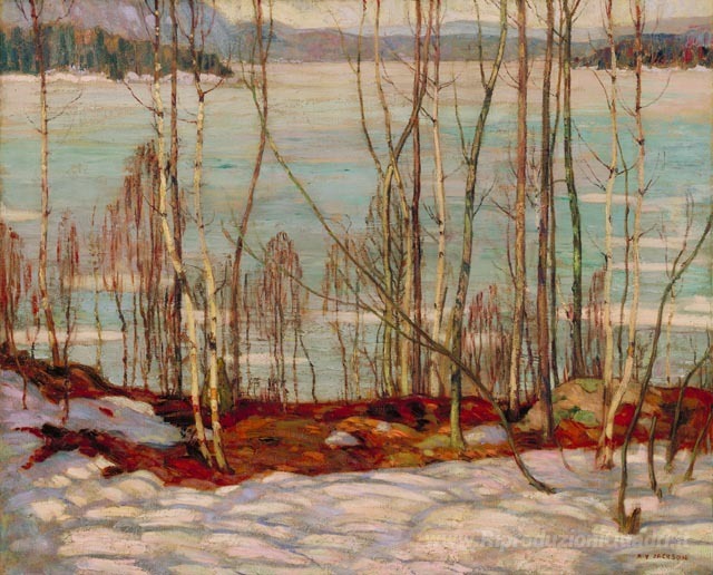 Ti offriamo una riproduzione artigianale su tela dell'opera famosa 'Frozen Lake, all'inizio della primavera, Algonquin Park' di A.Y. Jackson, dal Museo delle Riproduzioni.