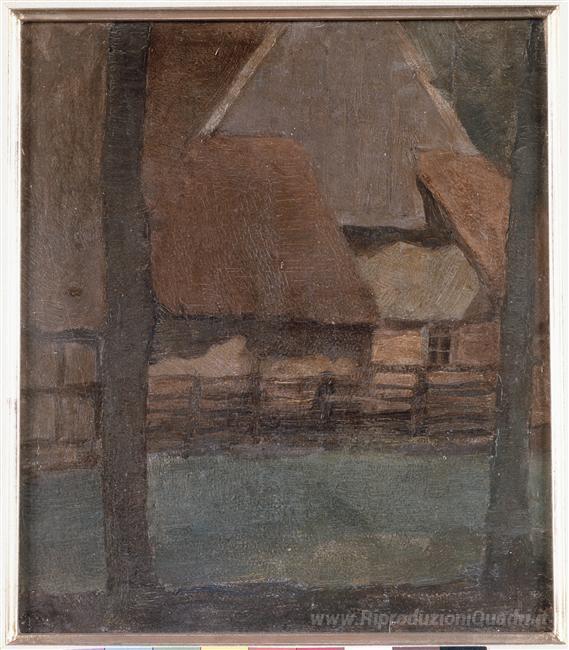 Ti offriamo una riproduzione artigianale su tela dell'opera famosa 'Gable Fattoria con alberi' di Piet Mondrian, dal Museo delle Riproduzioni.