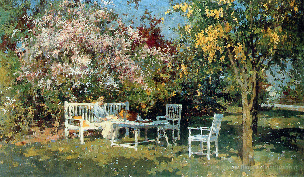 Il distintivo stile di Vreedenburgh è caratterizzato da una tecnica meticolosa che unisce impressionismo e realismo, conferendo una straordinaria profondità e luminosità al suo lavoro. Le sfumature vibranti dei colori e il gioco di luce e ombra esaltano l’atmosfera serena del giardino, rendendo Giardino con alberi in fiore un elemento ideale per arricchire gli interni di ogni abitazione. Questa opera non solo valorizza l'estetica degli spazi, ma crea anche un ambiente rilassante e accogliente, perfetto per chi cerca di portare un tocco di natura e tranquillità nella propria casa.