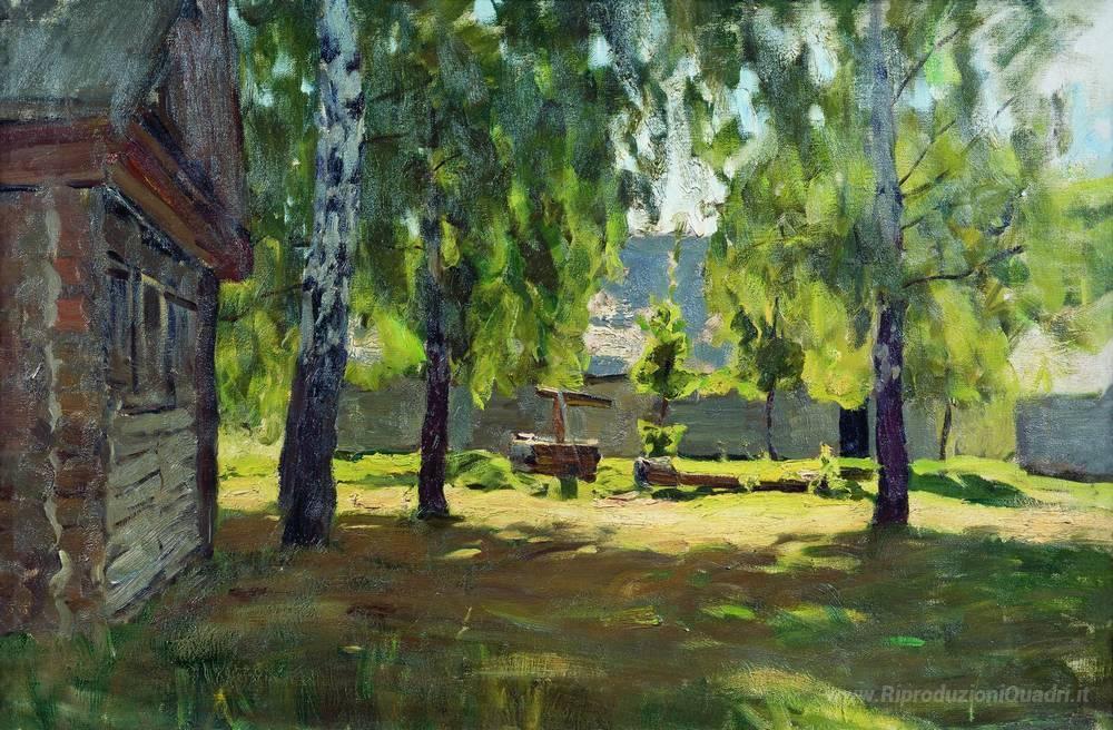 Ti offriamo una riproduzione artigianale su tela dell'opera famosa 'Giorno soleggiato. Vicino alla isba.' di Isaac Levitan, dal Museo delle Riproduzioni.