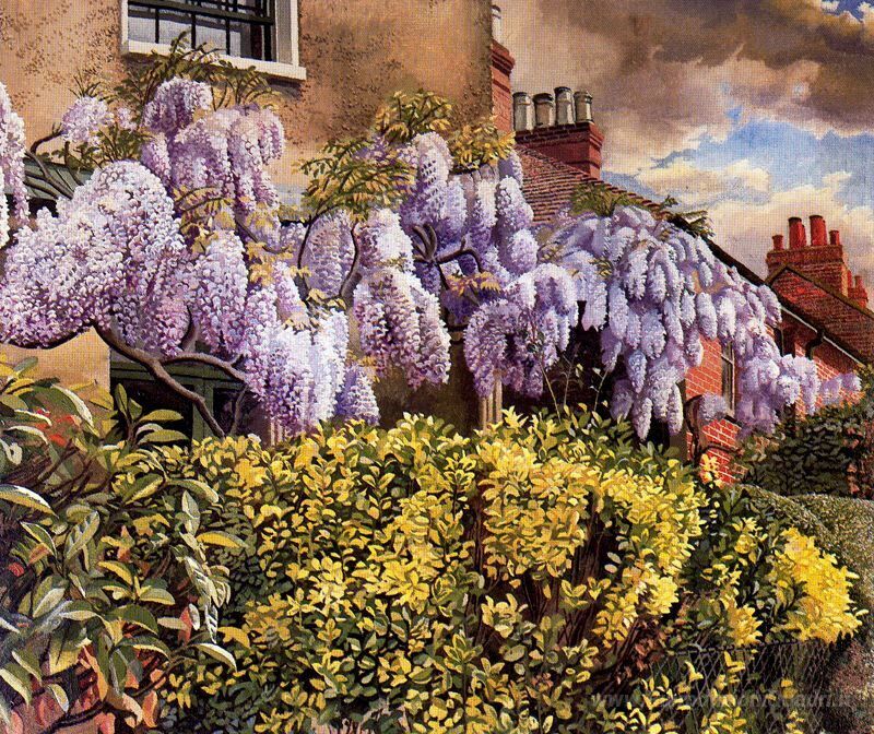 Con Glicine. Cookham, l'artista ci regala un'interpretazione evocativa di un giardino rigoglioso, dove gli affascinanti glicini si intrecciano in un abbraccio di colori vibranti. Grazie alle tecniche a olio sofisticate utilizzate da Spencer, ogni pennellata racconta una storia, trasformando il dipinto in un elemento d'arredo capace di esaltare l'atmosfera dei vostri spazi, donando un tocco di serenità e bellezza nel vostro quotidiano.