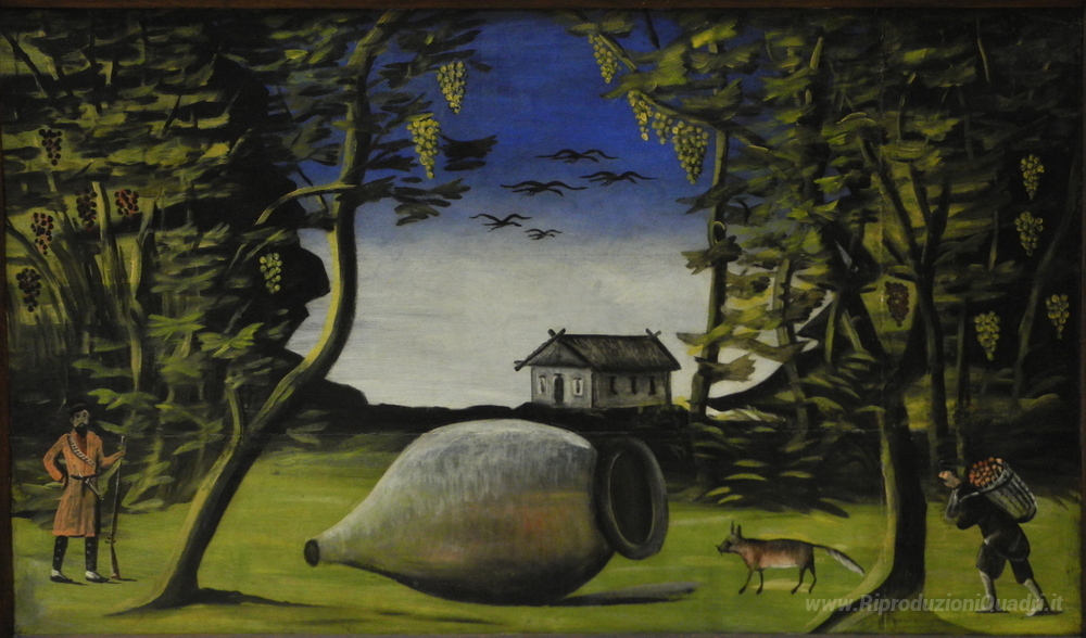 Ti offriamo una riproduzione artigianale su tela dell'opera famosa 'Grande Marani nella foresta' di Niko Pirosmani, dal Museo delle Riproduzioni.