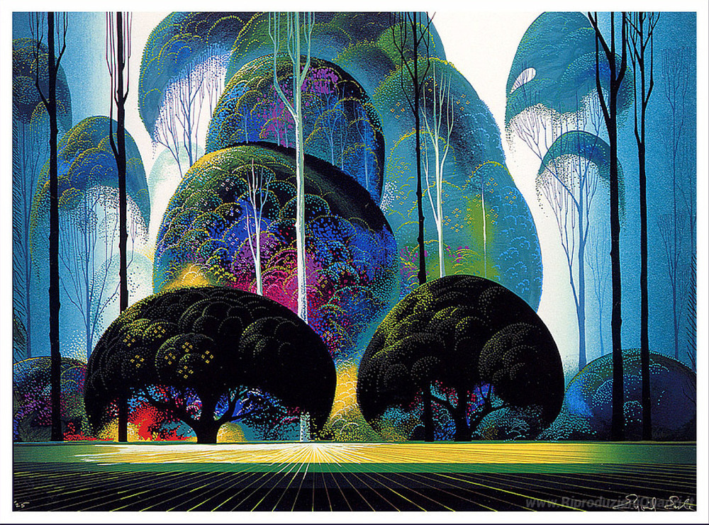 Ti offriamo una riproduzione artigianale su tela dell'opera famosa 'Green Forest' di Eyvind Earle, dal Museo delle Riproduzioni.