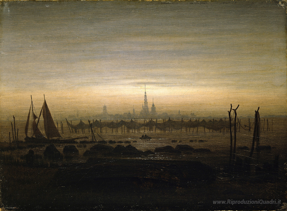 Ti offriamo una riproduzione artigianale su tela dell'opera famosa 'Greifswald in chiaro di luna' di Caspar David Friedrich, dal Museo delle Riproduzioni.