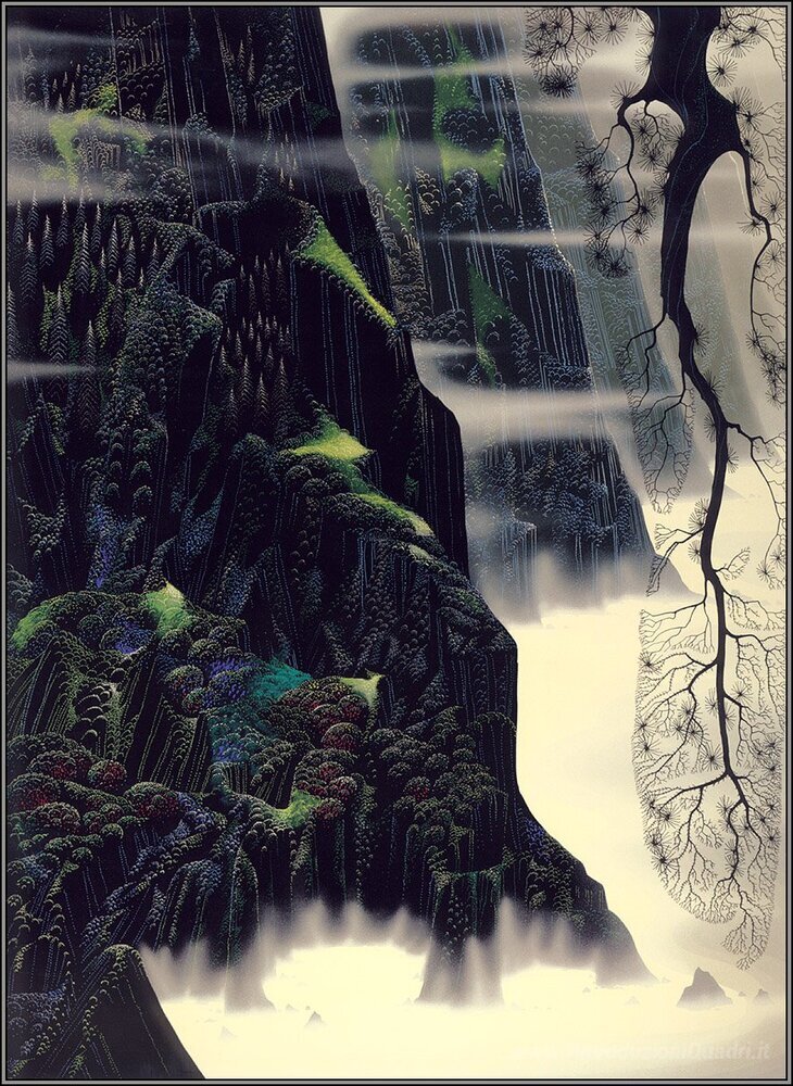 Ti offriamo una riproduzione artigianale su tela dell'opera famosa 'Grigio Alba' di Eyvind Earle, dal Museo delle Riproduzioni.