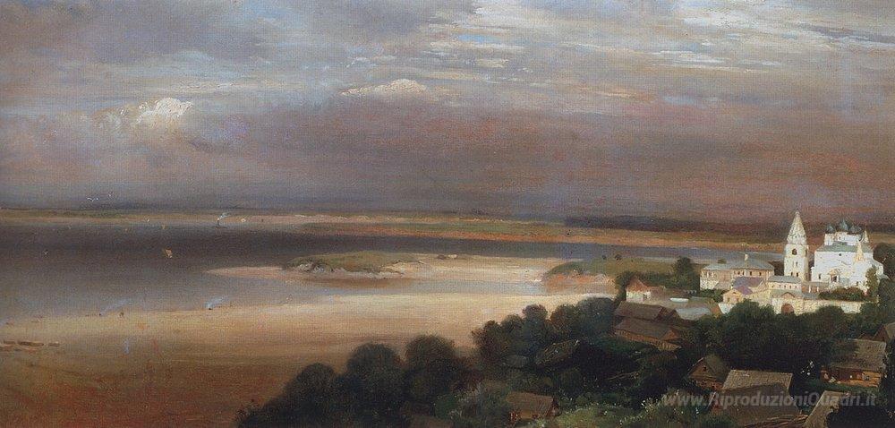 Ti offriamo una riproduzione artigianale su tela dell'opera famosa 'Grotte di Monastero vicino Nizhny Novgorod' di Aleksey Savrasov, dal Museo delle Riproduzioni.