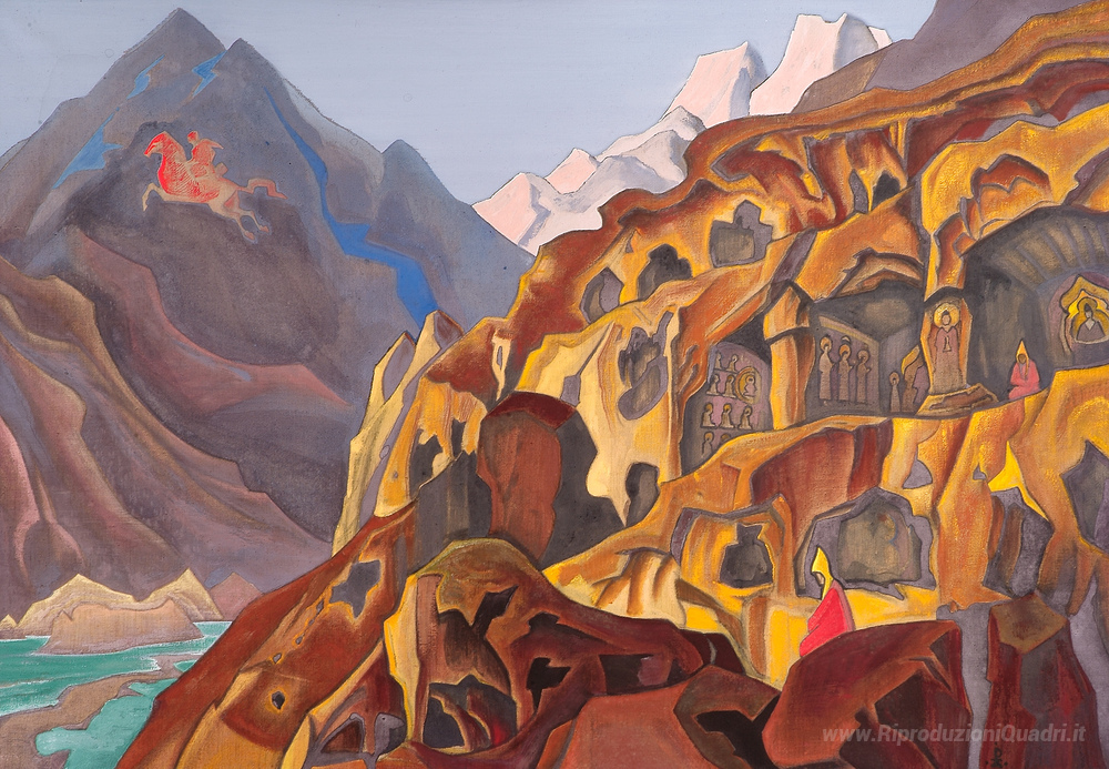 Ti offriamo una riproduzione artigianale su tela dell'opera famosa 'Grotte sacre' di Nicholas Roerich, dal Museo delle Riproduzioni.