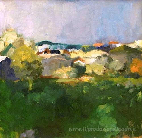 Ti offriamo una riproduzione artigianale su tela dell'opera famosa 'Gruppo di Case' di Elmer Bischoff, dal Museo delle Riproduzioni.
