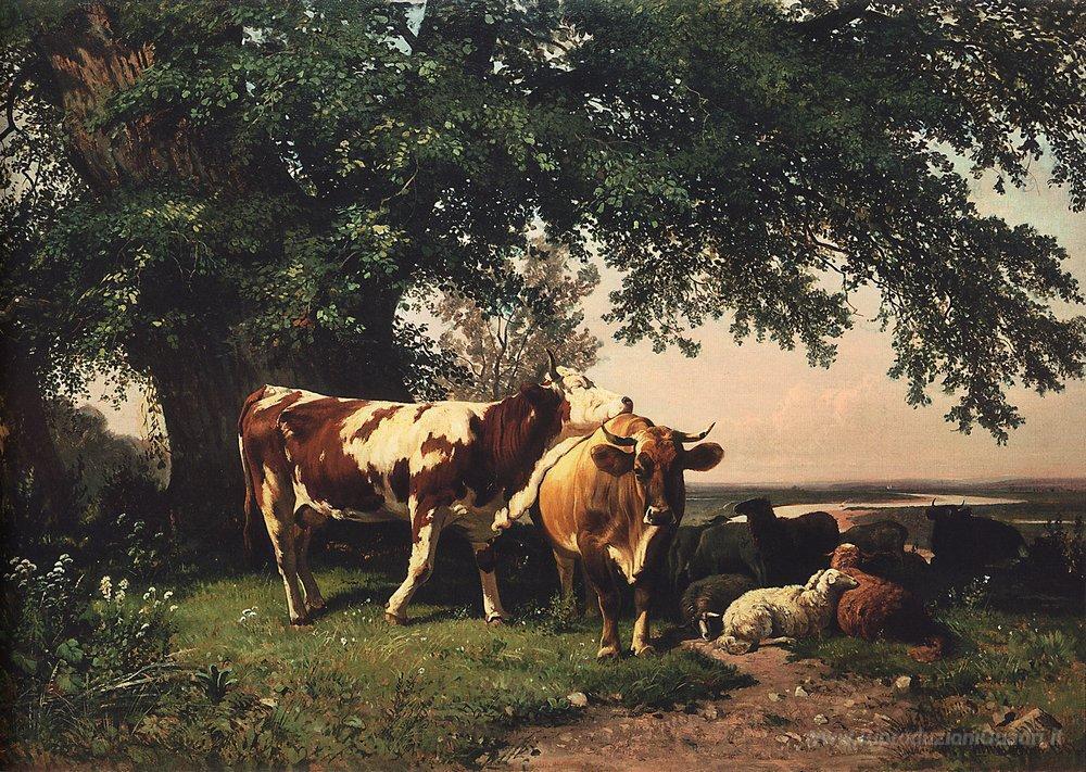 Ti offriamo una riproduzione artigianale su tela dell'opera famosa 'Herd sotto gli alberi' di Ivan Shishkin, dal Museo delle Riproduzioni.