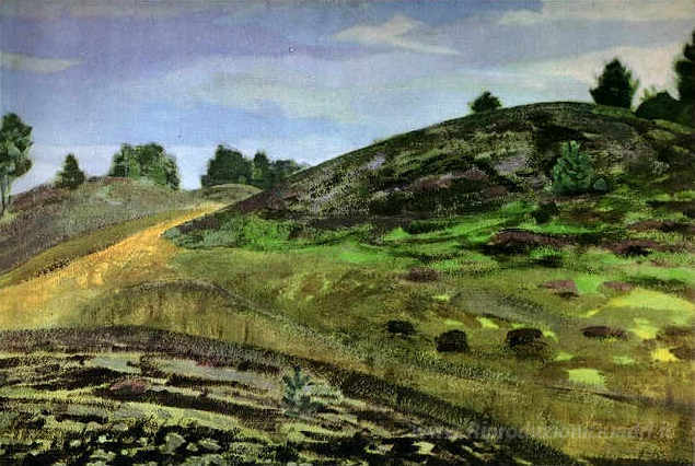 Ti offriamo una riproduzione artigianale su tela dell'opera famosa 'Hills' di Nicholas Roerich, dal Museo delle Riproduzioni.