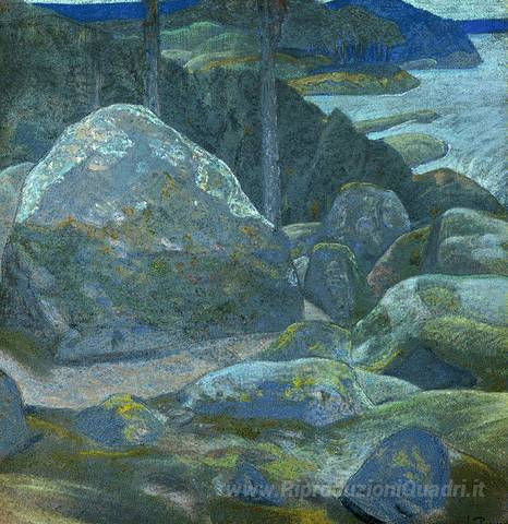 Ti offriamo una riproduzione artigianale su tela dell'opera famosa 'Hoary Finlandia' di Nicholas Roerich, dal Museo delle Riproduzioni.