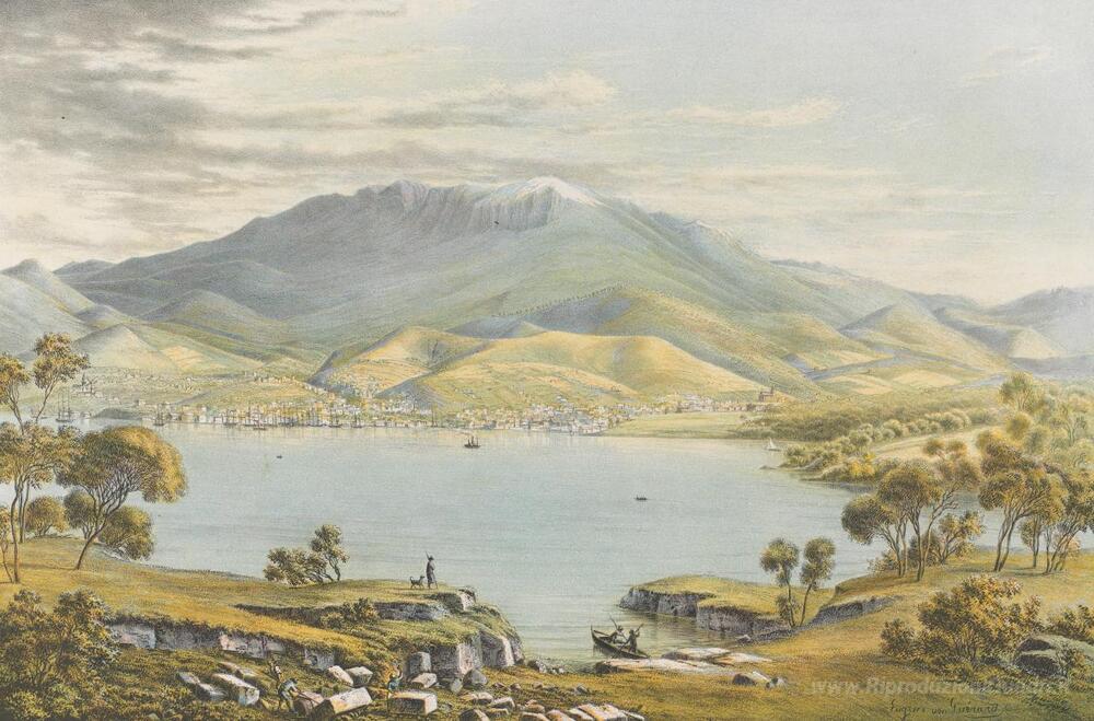Ti offriamo una riproduzione artigianale su tela dell'opera famosa 'Hobart Town' di Eugene von Guerard, dal Museo delle Riproduzioni.