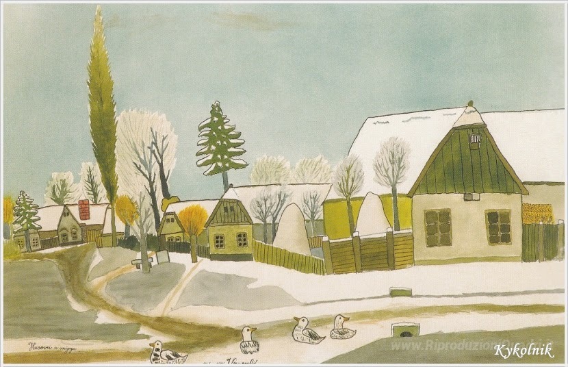 Ti offriamo una riproduzione artigianale su tela dell'opera famosa 'Husovtsy nella neve' di Ivan Generalic, dal Museo delle Riproduzioni.