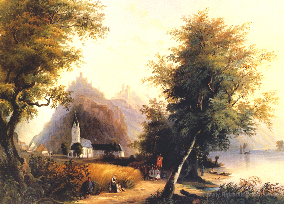 Ti offriamo una riproduzione artigianale su tela dell'opera famosa 'I "fratelli nemici" nel Bornhofen sul Reno con vista convento e ' di Karl Bodmer, dal Museo delle Riproduzioni.
