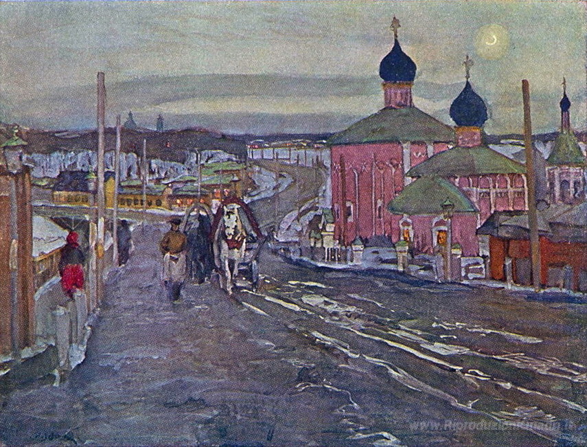 Ti offriamo una riproduzione artigianale su tela dell'opera famosa 'Il crepuscolo' di Konstantin Yuon, dal Museo delle Riproduzioni.
