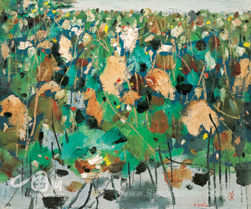 Ti offriamo una riproduzione artigianale su tela dell'opera famosa 'Il fascino di Lotus Pond' di Wu Guanzhong, dal Museo delle Riproduzioni.