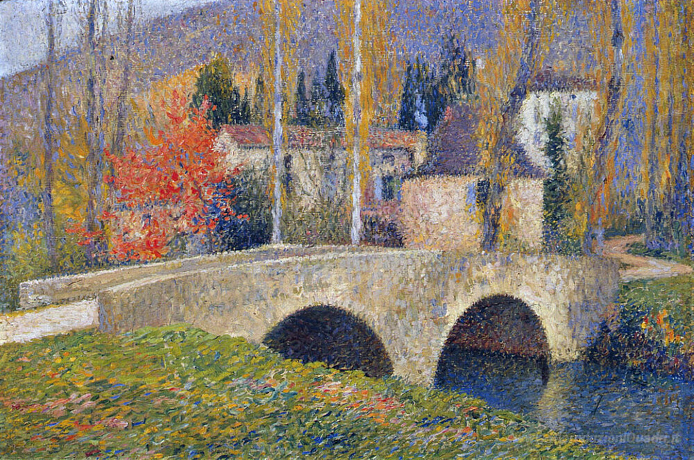 Ti offriamo una riproduzione artigianale su tela dell'opera famosa 'Il ponte a Labastide du Vert in autunno' di Henri Martin, dal Museo delle Riproduzioni.