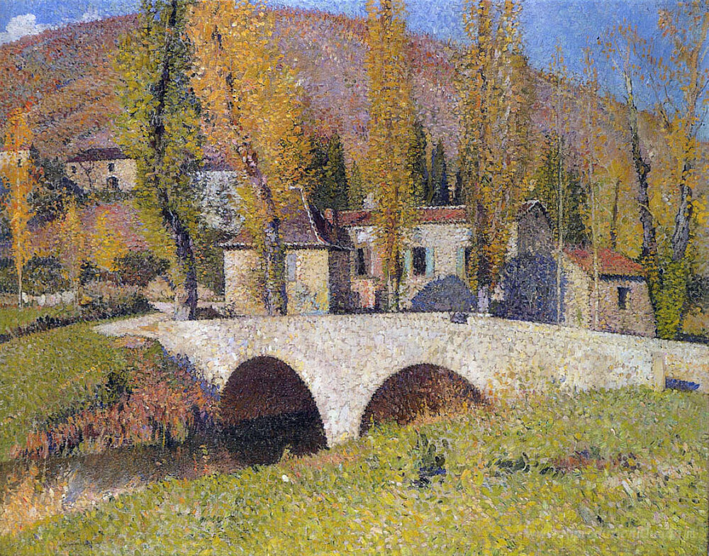 Ti offriamo una riproduzione artigianale su tela dell'opera famosa 'Il ponte a Labastide du Vert' di Henri Martin, dal Museo delle Riproduzioni.