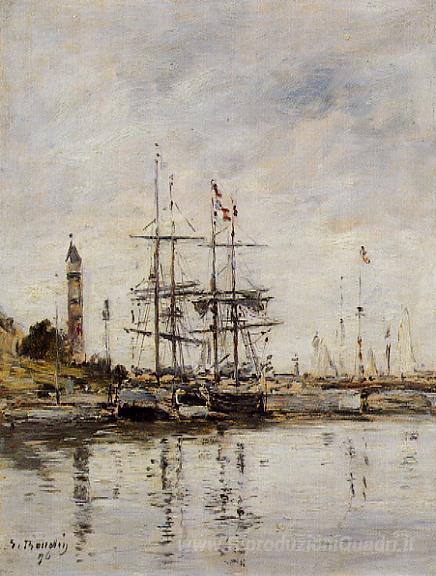 Ti offriamo una riproduzione artigianale su tela dell'opera famosa 'Il porto di Deauville' di Eugene Boudin, dal Museo delle Riproduzioni.