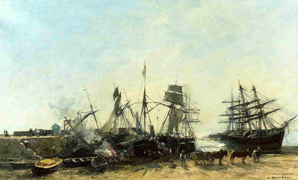 Ti offriamo una riproduzione artigianale su tela dell'opera famosa 'Il porto Portrieux con la bassa marea scarico pesce' di Eugene Boudin, dal Museo delle Riproduzioni.