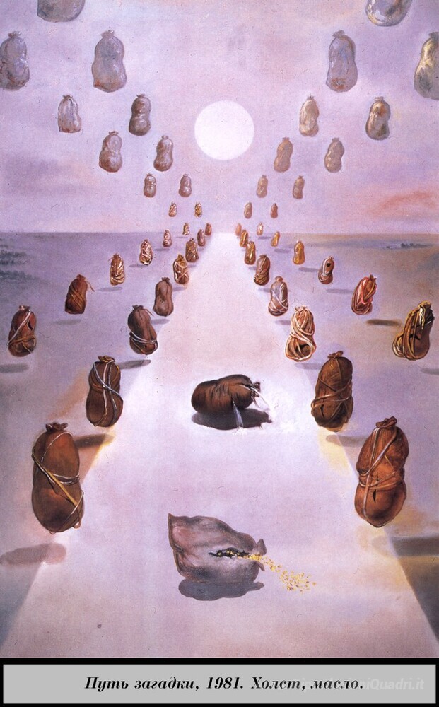 Ti offriamo una riproduzione artigianale su tela dell'opera famosa 'Il Sentiero di Enigma' di Salvador Dali, dal Museo delle Riproduzioni.