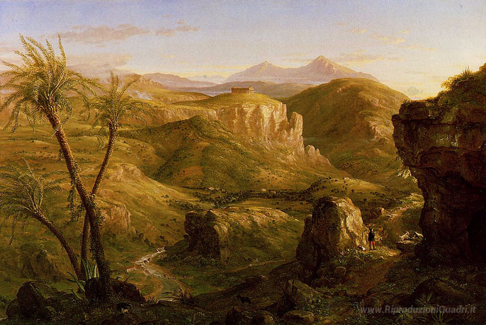 Ti offriamo una riproduzione artigianale su tela dell'opera famosa 'Il Vale e tempio di Segesta, Sicilia' di Thomas Cole, dal Museo delle Riproduzioni.