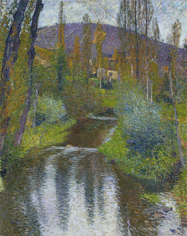 Ti offriamo una riproduzione artigianale su tela dell'opera famosa 'Il Vert e le prime case di Labastide' di Henri Martin, dal Museo delle Riproduzioni.