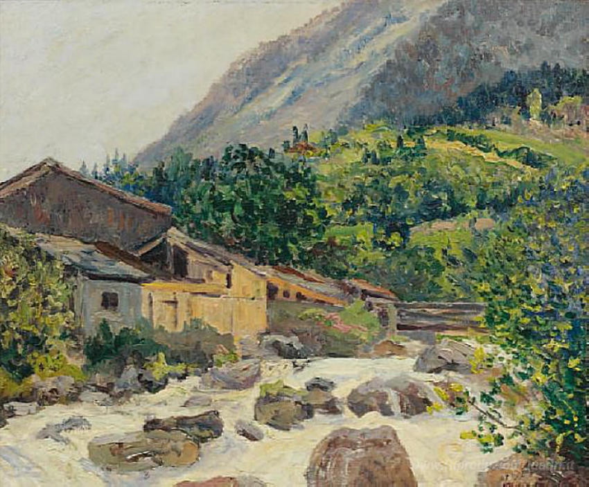 Ti offriamo una riproduzione artigianale su tela dell'opera famosa 'Il villaggio sul fiume, Bozel' di Maxime Maufra, dal Museo delle Riproduzioni.
