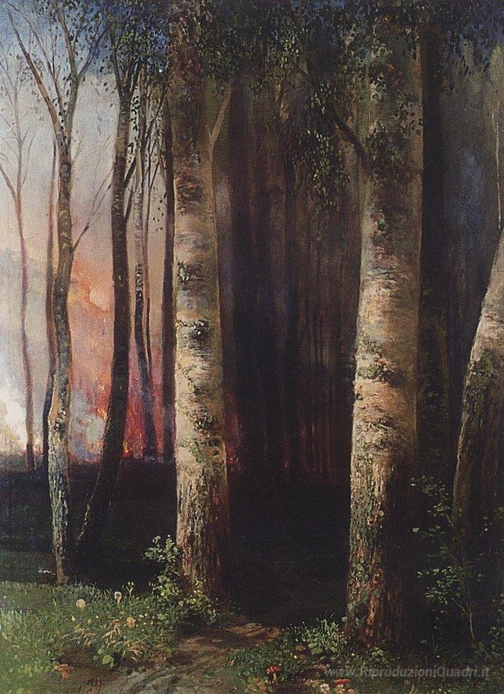 Ti offriamo una riproduzione artigianale su tela dell'opera famosa 'Incendio nei boschi' di Aleksey Savrasov, dal Museo delle Riproduzioni.