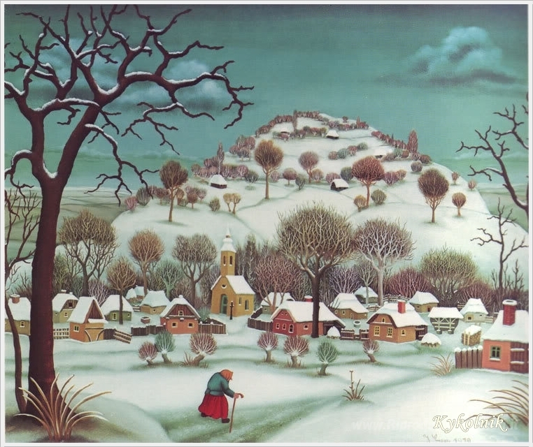 Ti offriamo una riproduzione artigianale su tela dell'opera famosa 'Inverno in un paesino' di Ivan Generalic, dal Museo delle Riproduzioni.