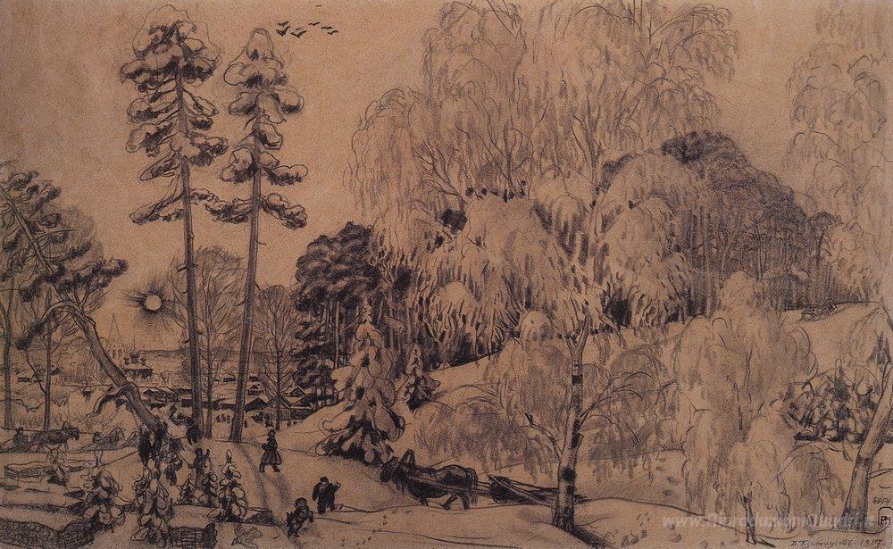 Ti offriamo una riproduzione artigianale su tela dell'opera famosa 'Inverno' di Boris Kustodiev, dal Museo delle Riproduzioni.