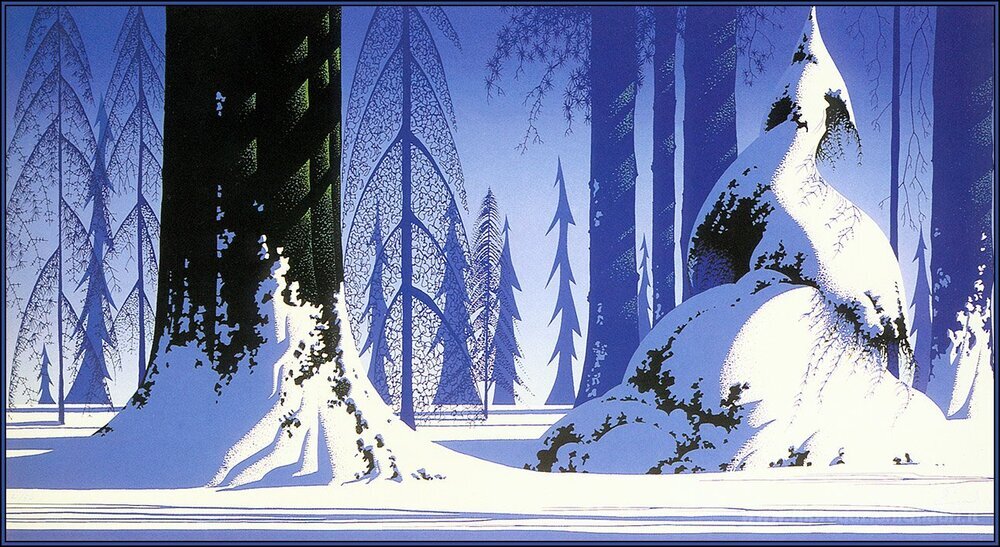 Ti offriamo una riproduzione artigianale su tela dell'opera famosa 'Inverno' di Eyvind Earle, dal Museo delle Riproduzioni.