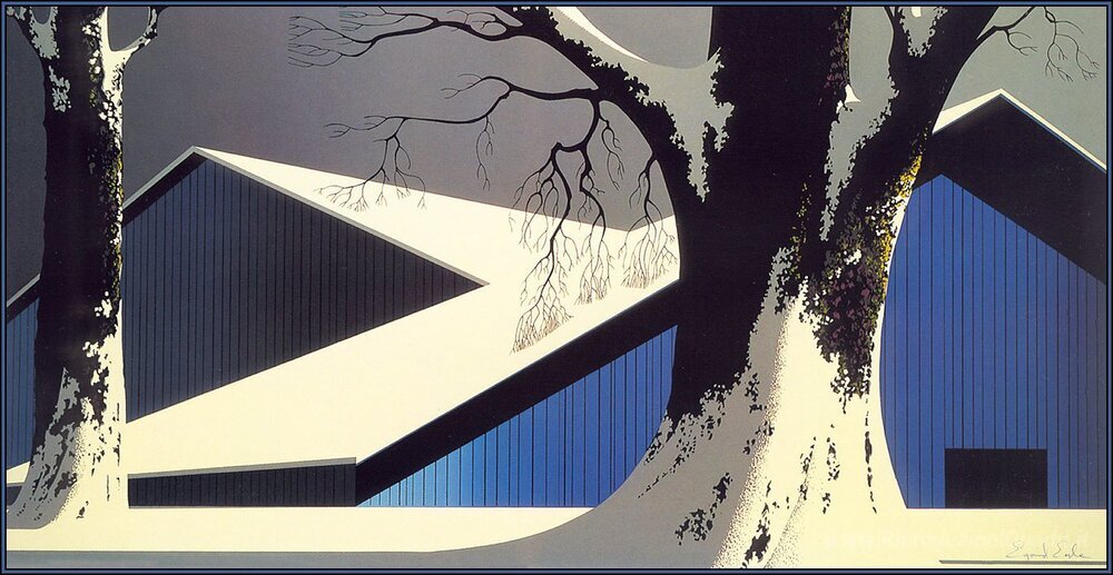 Ti offriamo una riproduzione artigianale su tela dell'opera famosa 'Inverno tranquillo' di Eyvind Earle, dal Museo delle Riproduzioni.