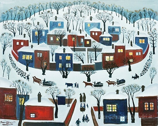 Ti offriamo una riproduzione artigianale su tela dell'opera famosa 'Inverno Village' di Radi Nedelchev, dal Museo delle Riproduzioni.