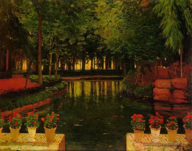 Ti offriamo una riproduzione artigianale su tela dell'opera famosa 'Jardines de Aranjuez 2' di Santiago Rusinol, dal Museo delle Riproduzioni.