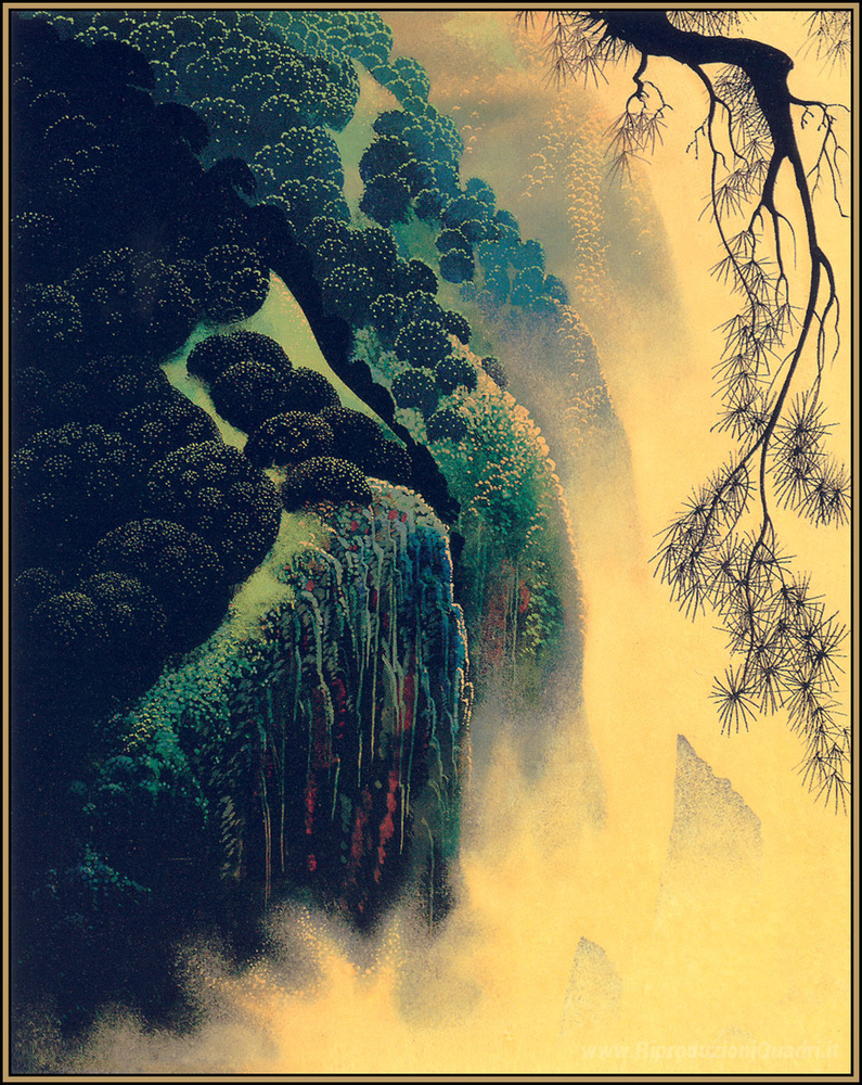 Ti offriamo una riproduzione artigianale su tela dell'opera famosa 'Jeweled Coast' di Eyvind Earle, dal Museo delle Riproduzioni.