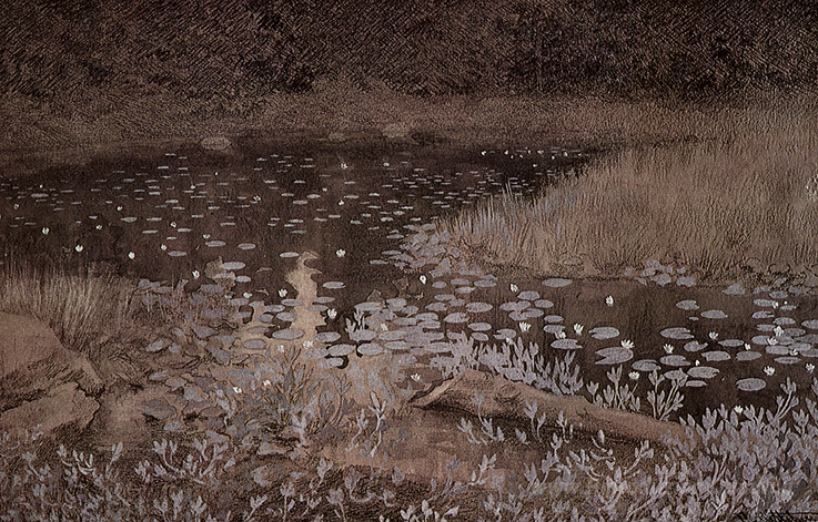 Ti offriamo una riproduzione artigianale su tela dell'opera famosa 'Jomfruland Lilypond' di Theodor Severin Kittelsen, dal Museo delle Riproduzioni.