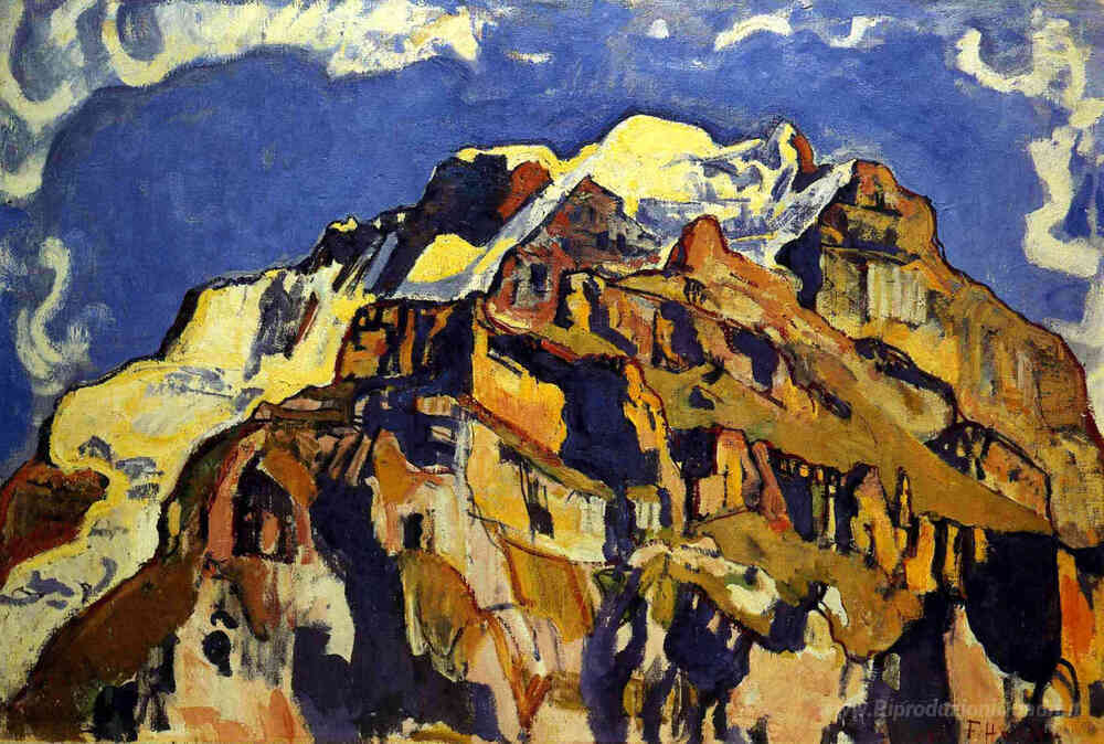 Ti offriamo una riproduzione artigianale su tela dell'opera famosa 'Jungfrau e Silverhorn, come visto da Mürren' di Ferdinand Hodler, dal Museo delle Riproduzioni.