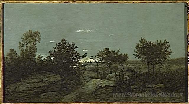 Ti offriamo una riproduzione artigianale su tela dell'opera famosa 'La campagna all'alba' di Theodore Rousseau, dal Museo delle Riproduzioni.