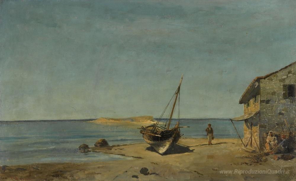 Ti offriamo una riproduzione artigianale su tela dell'opera famosa 'La casa del pescatore sulla spiaggia' di Konstantinos Volanakis, dal Museo delle Riproduzioni.