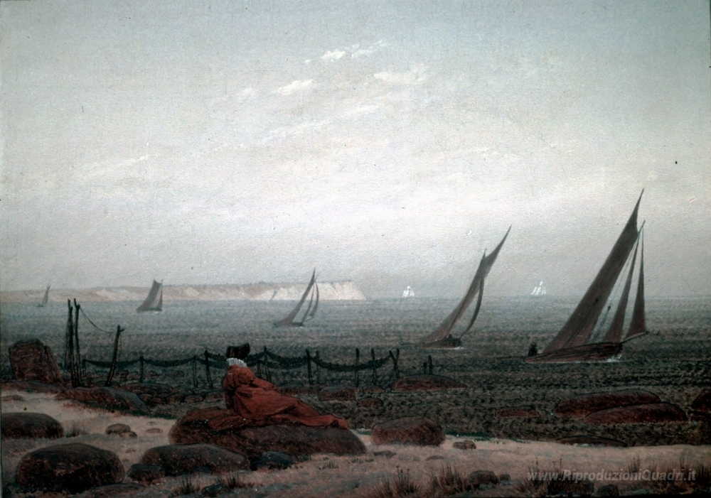 Ti offriamo una riproduzione artigianale su tela dell'opera famosa 'La donna sulla spiaggia di Ruegen' di Caspar David Friedrich, dal Museo delle Riproduzioni.