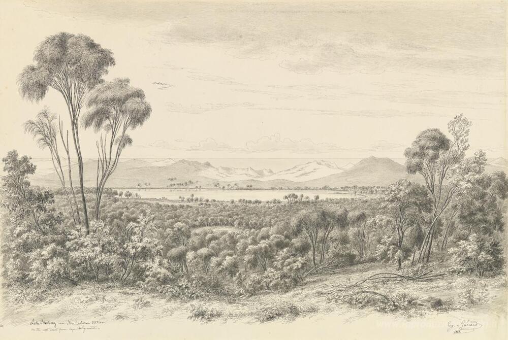 Ti offriamo una riproduzione artigianale su tela dell'opera famosa 'Lago Bonbong vicino alla stazione MacLachlan sulla costa occiden' di Eugene von Guerard, dal Museo delle Riproduzioni.