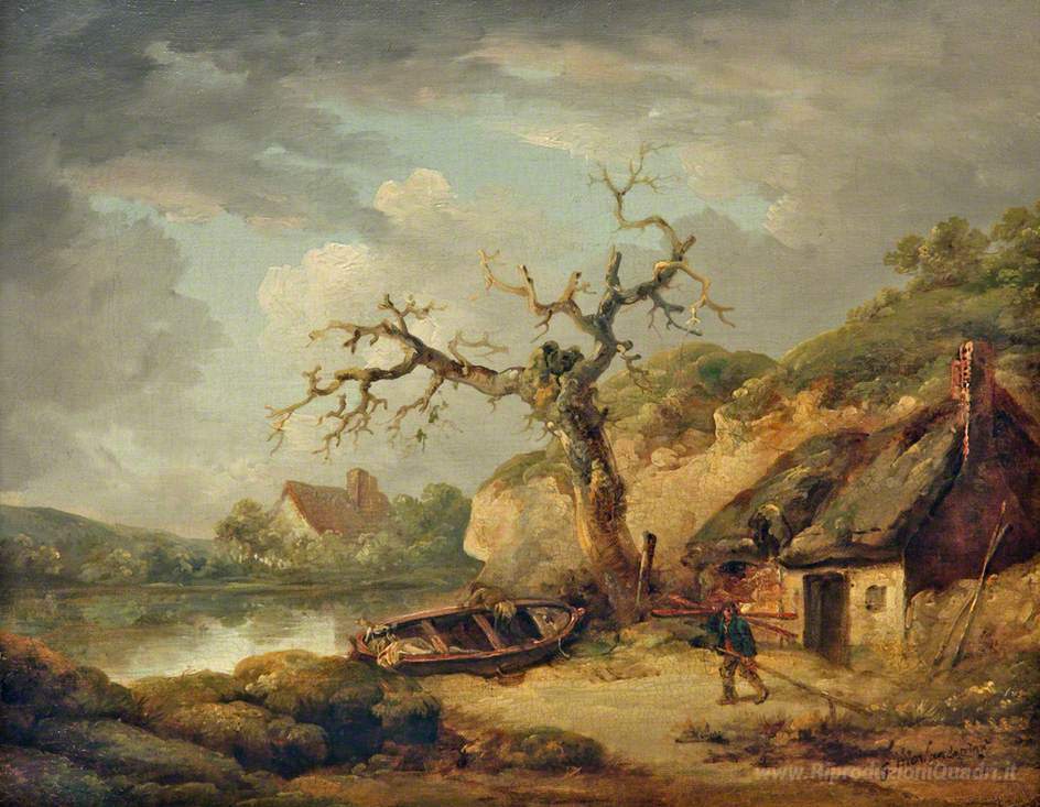 Ti offriamo una riproduzione artigianale su tela dell'opera famosa 'Lago di scena e un Cottage' di George Morland, dal Museo delle Riproduzioni.