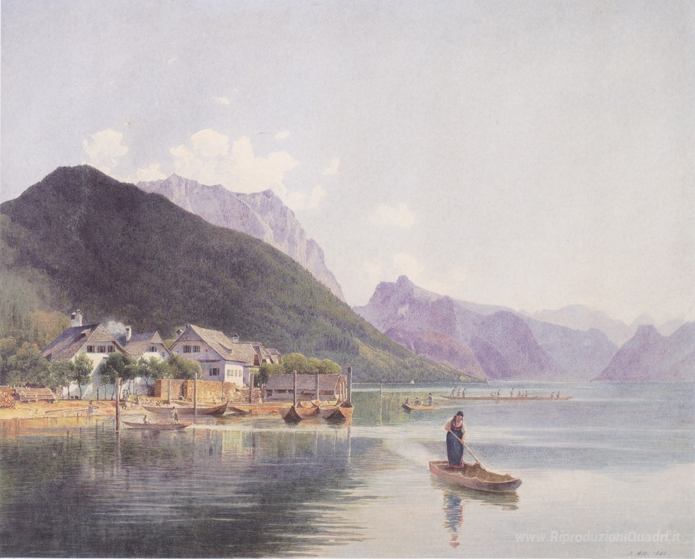Ti offriamo una riproduzione artigianale su tela dell'opera famosa 'Lago di Traun' di Rudolf von Alt, dal Museo delle Riproduzioni.