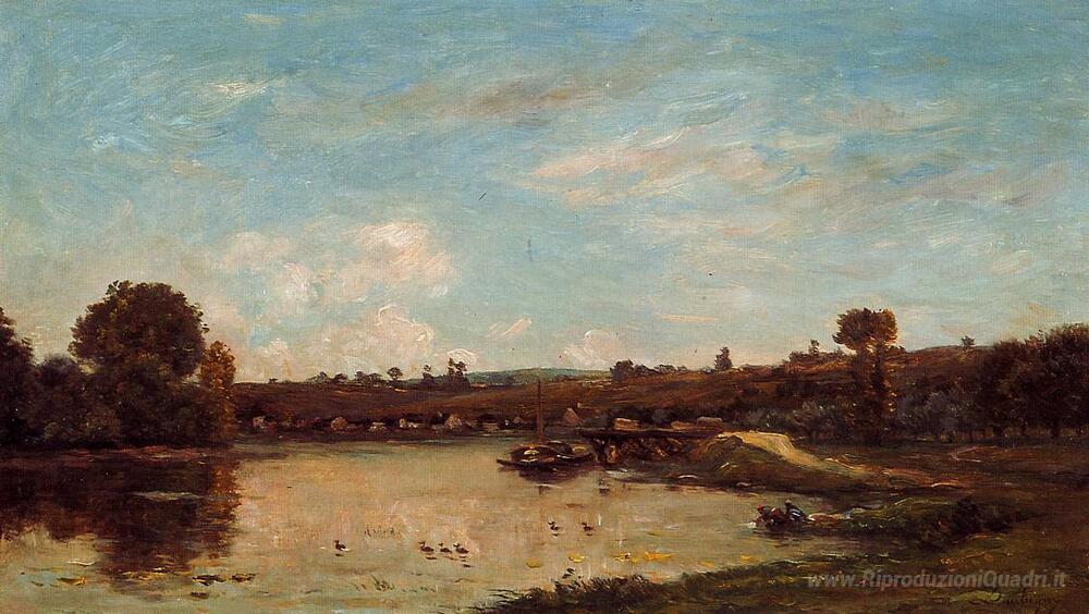 Ti offriamo una riproduzione artigianale su tela dell'opera famosa 'Lavandaia vicino Valdomdois' di Charles-Francois Daubigny, dal Museo delle Riproduzioni.