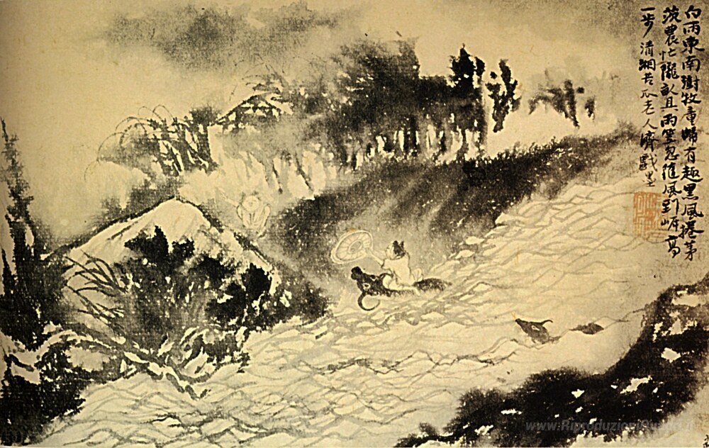 Ti offriamo una riproduzione artigianale su tela dell'opera famosa 'Le croci Torrent' di Shitao, dal Museo delle Riproduzioni.