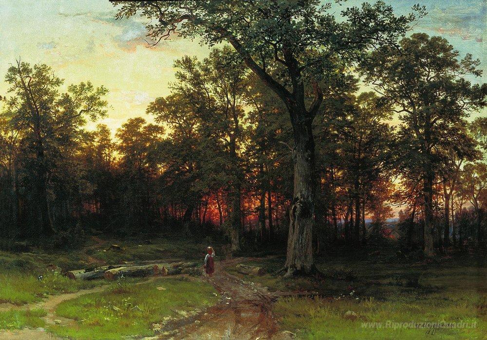 Ti offriamo una riproduzione artigianale su tela dell'opera famosa 'Legno in serata' di Ivan Shishkin, dal Museo delle Riproduzioni.