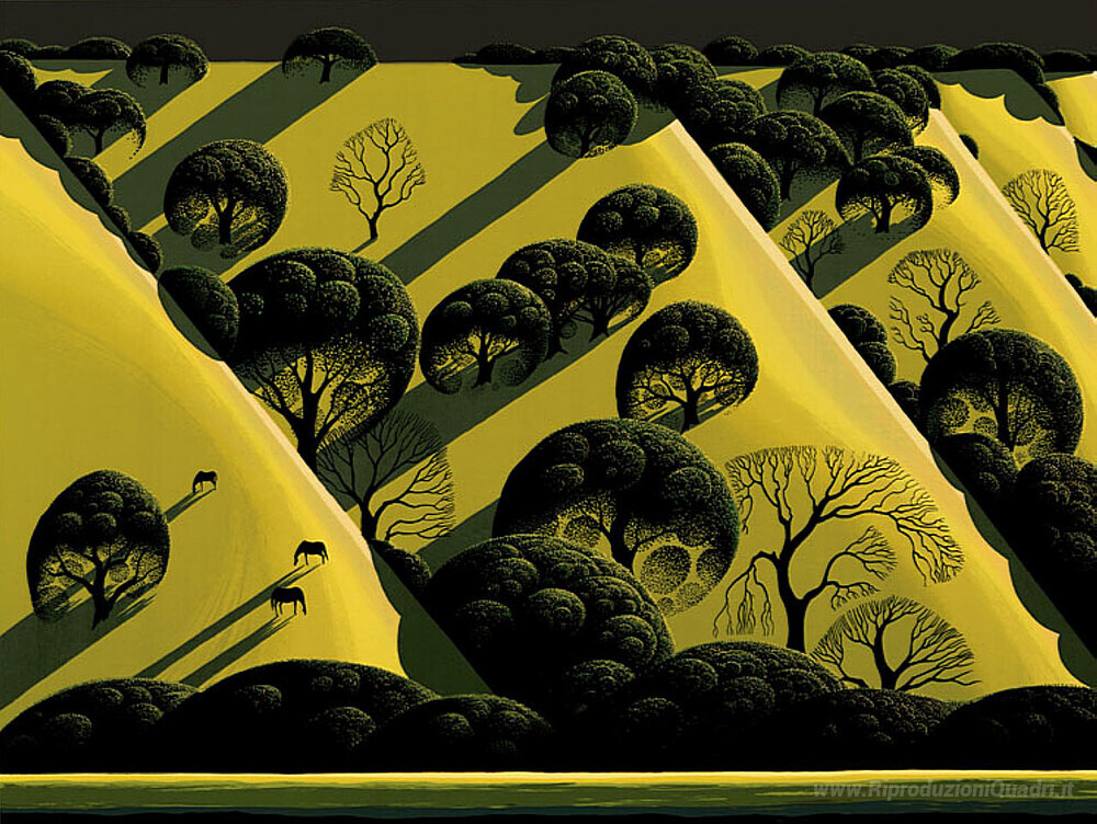 Ti offriamo una riproduzione artigianale su tela dell'opera famosa 'Live Oak Country' di Eyvind Earle, dal Museo delle Riproduzioni.